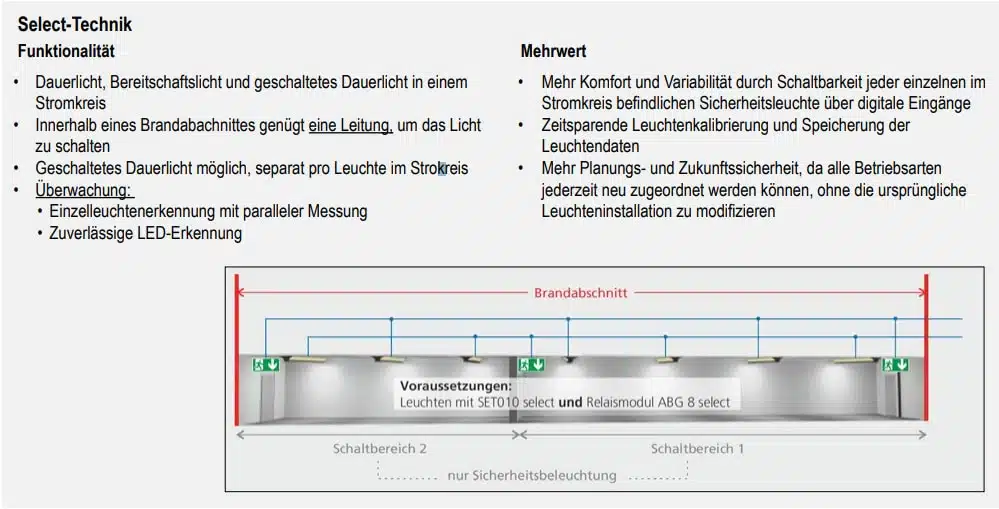 - Select-Technik: Schaltbarkeit jeder einzelnen im Stromkreis befindlichen Sicherheitsleuchte über digitale Eingänge (optinal)
