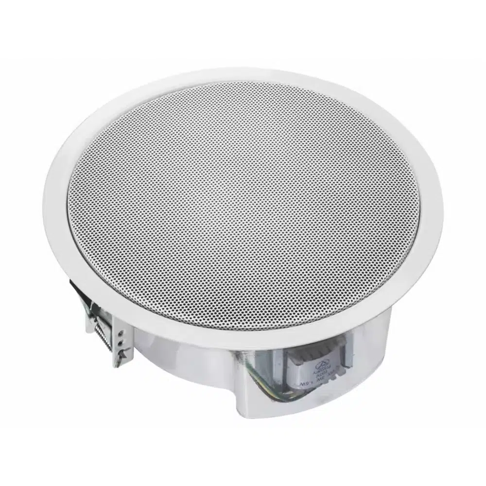 5824076 W Deckeneinbaulautsprecher EN 546W Deckeneinbau-Lautsprecher mitfeuchtigkeitsimprägniertem 130 mmBreitband-Lautsprecherchassis, mithochwertigem PET-Kunststoff-berührungsschutz.Innovatives Luftsströmungssystem, fürKlangeigenschaften, die einem Bassrefelexlautsprecher zugeschriebenwerden. Gehäuse aus Metall, extrem flacheBauweise. Durch Schutzklasse IP 21C gegen die Risiken von Umwelteinflüssen gesichert.Montage über 3 Federschnappverschlüssemit gekröpfter Schenkelfeder, verstärkter Klemmkraft und kürzerem Spannweg. Der Anschluss erfolgt über eine 4-poligeSchraubklemme. RoHS-Konform.Leistungsmerkmale• Hoher Schalldruckpegel• extrem flache Bauweise• antistatischer KunststoffberührungsschutzTechnische DatenNennbelastbarkeit 6 WTransformatoranzapfung: 6 / 3 / 1,5 WNennimpedanz: 1.67 / 3.33 / 6.67 k OhmEmpfindlichkeit: 1 W / 1 m 86,8 dBÜbertragungsbereich: 104 Hz ... 17200 HzÖffnungswinkel (-6dB): 180° @ 1kHzUmgebungstemperatur: -10 °C ... 55 °CFarbe: weiß, ähnlich RAL 9016Gewicht: ca. 0.51 kgDeckenöffnung: (d min.) 156 mmAbmessungen: d: 181,5 mm T: 65 mmFabrikat: HoneywellTyp:6W Deckeneinbaulautsprecher EN 54Artikel: 582407Alternativ: