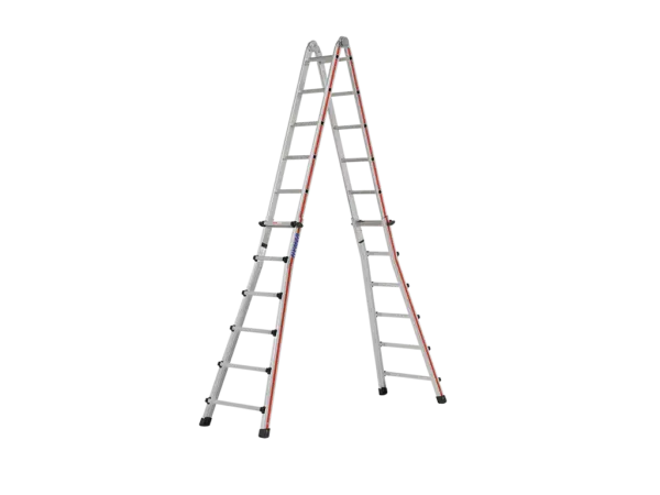 Durch ent- und verriegelbare Sicherheitsgelenke schneller Umbau von Steh- zu Anlegeleiter möglich. Mühelose Verstellung von Sprosse zu Sprosse durch seitliche Sicherheits-Rastschlüsse. Standsicher durch Gummiauflagen und seitlich ausklappbarer Standverbreiterung. Auf kleinstem Raum zu transportieren und aufzubewahren.